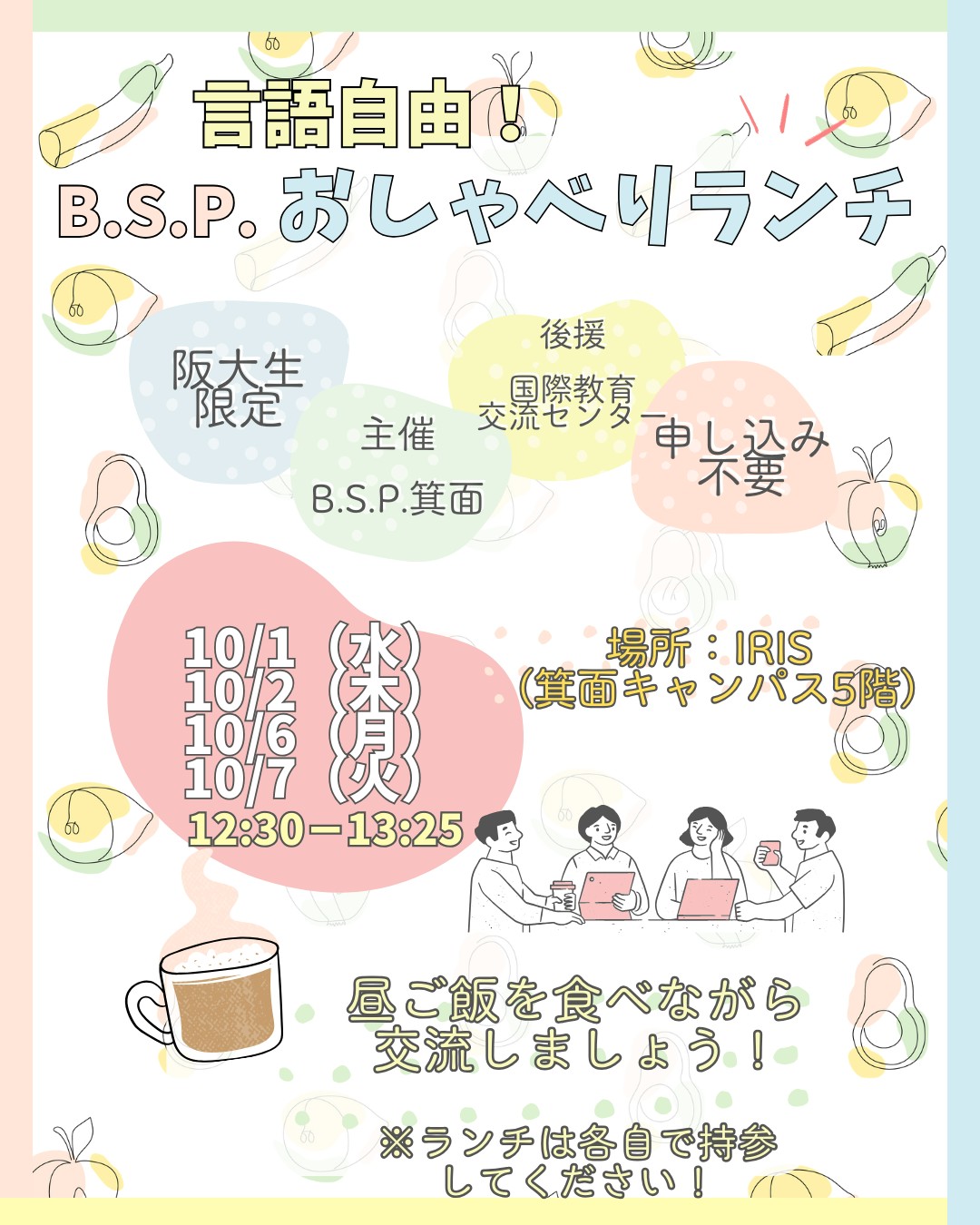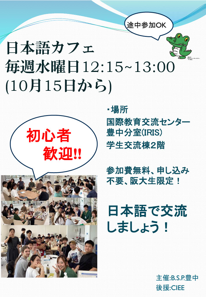 2025年4月10日(木)12:15から、B.S.P.吹田による「日本語カフェ」がIRISにて開催され、留学生8名、日本人等一般学生5名が参加しました。