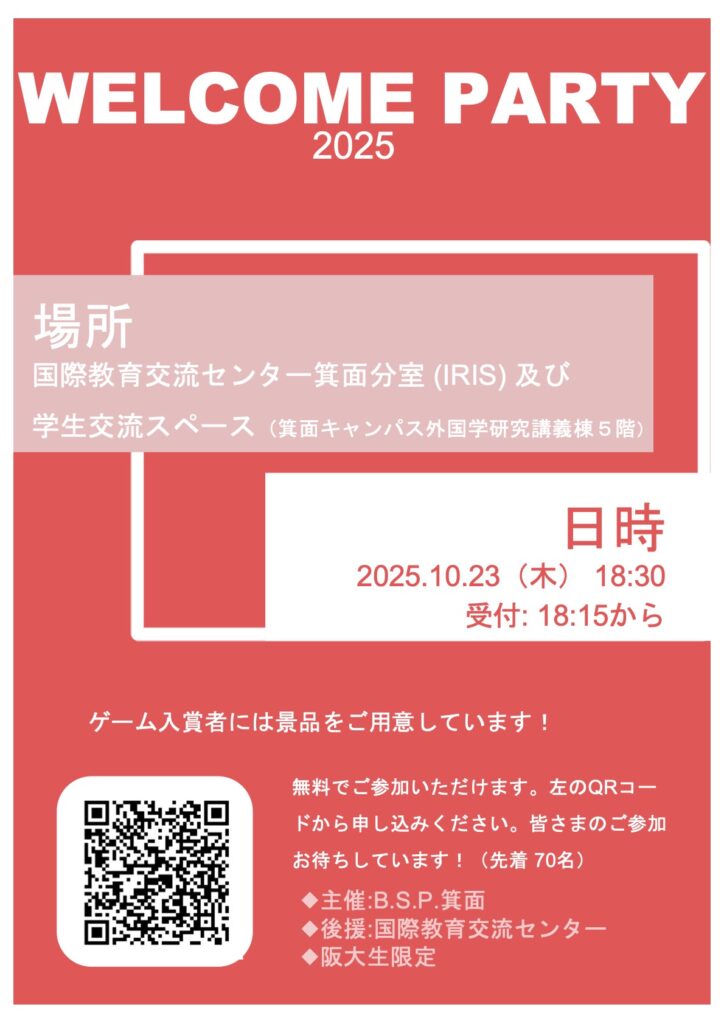 2025年4月25日(金)17:30~ B.S.P.豊中による「ウェルカムパーティー」が開催され、留学生 50名、日本人等一般学生 36名が参加しました。ビンゴゲームから始まり、いろいろな形式のクイズ、そして今回は豆つかみ、ビアポン、ジェンガ等のブースを設け、参加者が好きなゲームを楽しみながら交流する、体験型形式の時間もありました。クイズやゲームを通じて自然と会話が弾み、笑顔があふれるとても良い交流の機会となりました。
