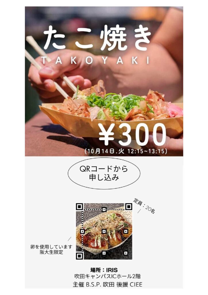 2025年5月13日(火)12:15~、IRISにてB.S.P.吹田による「たこ焼き作りイベント」が開催されました。