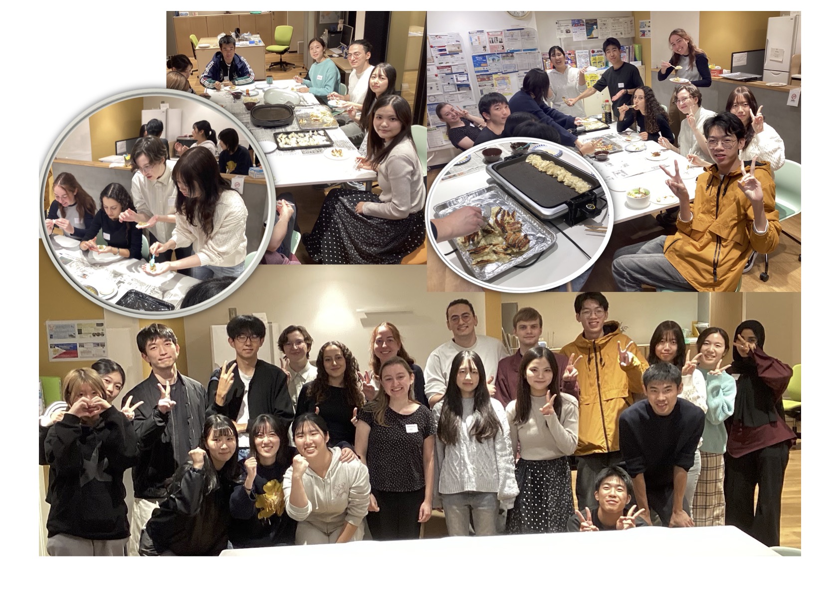 留学生15名、日本人等一般学生8名が参加しました。具材は鶏肉とジャガイモの2種類を用意し、参加者自身で餃子の皮に包む作業を行いました。