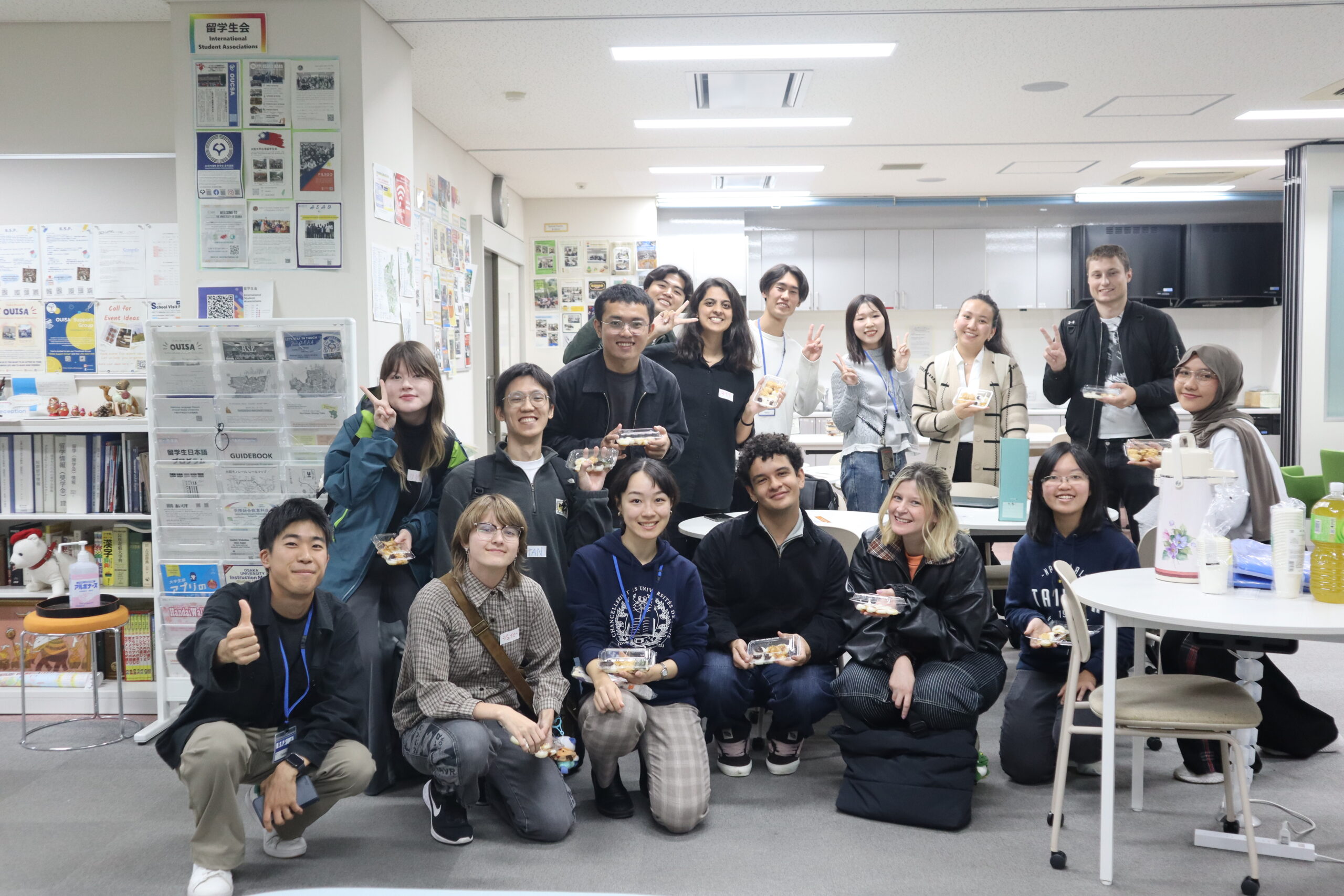 2025年6月6日(金)12:15~ B.S.P.豊中による「世界のお菓子パーティー」が開催され、留学生8名、日本人等一般学生10名が参加しました。はじめに、B.S.Pメンバーが用意した世界のお菓子を紹介し、お菓子を食べながらの交流が始まりました。中には、好きなお菓子を持参して紹介する参加者もいて、お菓子を通じた会話が弾み、楽しいひと時となりました。