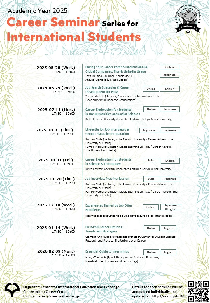This series is tailored specifically for international students at OU who are keen to acquire fundamental insights into job searching in Japan. It encompasses a range of crucial topics, including Japanese business culture, self-assessment, resource exploration, interview preparation, and valuable insights from alumni, among other relevant subjects.
